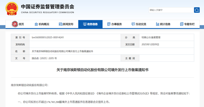 瑞财经 赵盼盼 12月9日,中国证监会国际合作司发布关于南京埃斯顿自动化股份有限公司(以下简称“埃斯顿”)境外发行上市备案通知书。