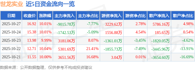 证券之星消息,世龙实业10月27日涨停收盘,收盘价16.92元。该股于10点15分涨停,3次打开涨停,截止收盘封单资金为2.06亿元,占其流通市值5.06%。