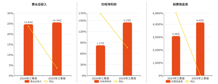 公司营业总收入为14.34亿元。归母净利润为2.23亿元。经营活动现金净流入为6.02亿元。