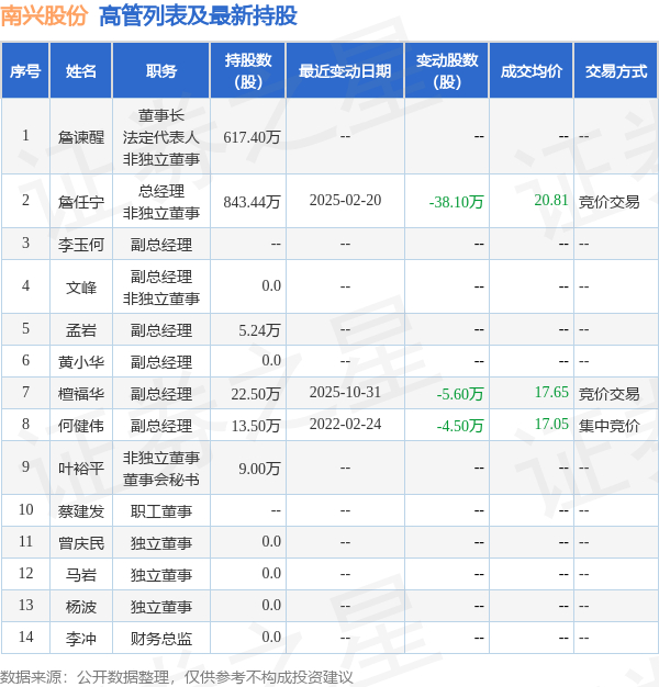 南兴股份的高管列表及最新持股情况如下: