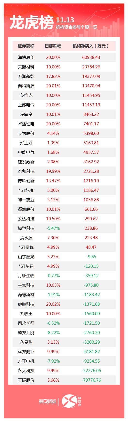 当天机构净买入前三的股票分别是海博思创、天赐材料、万润新能,净买入金额分别是6.09亿元、2.38亿元、1.94亿元。