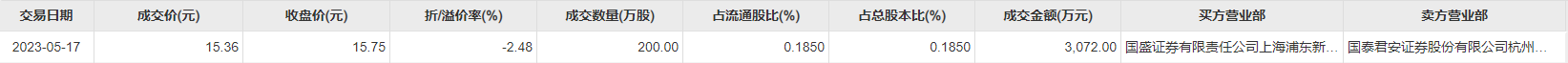 5月17日大宗交易成交200万股,成交额3072万元,占当日总成交额的23.49%,成交价15.36元,较市场收盘价15.75元折价2.48%。