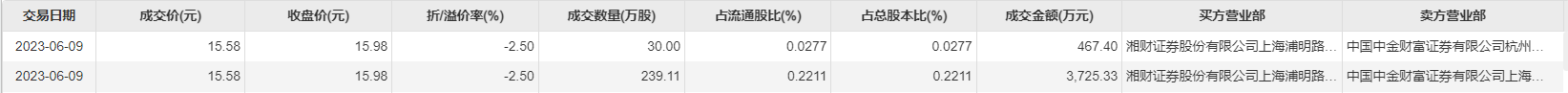6月9日大宗交易成交269.11万股,成交额4192.73万元,占当日总成交额的5.69%,成交价15.58元,较市场收盘价15.98元折价2.5%。