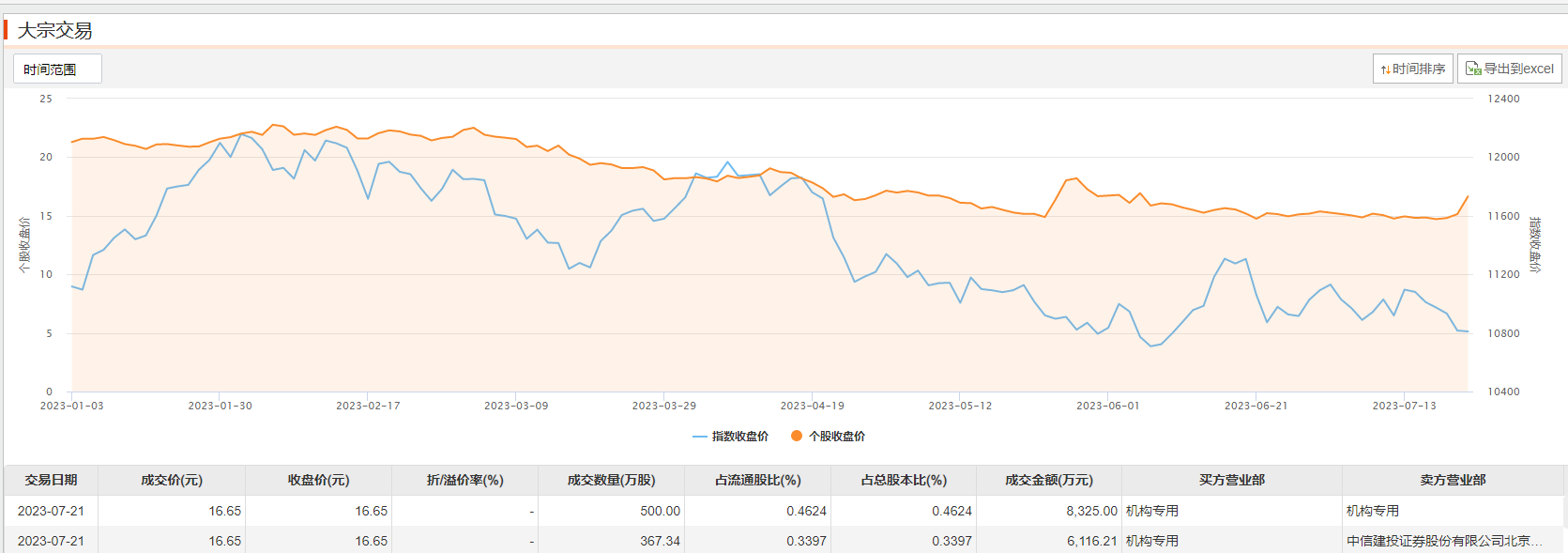 7月21日大宗交易成交867.34万股,成交额1.44亿元,占当日总成交额的11.14%,成交价16.65元,较市场收盘价16.65元持平。