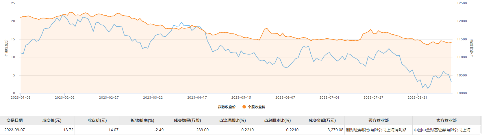 9月7日大宗交易成交239万股,成交额3279.08万元,占当日总成交额的7.31%,成交价13.72元,较市场收盘价14.07元折价2.49%。