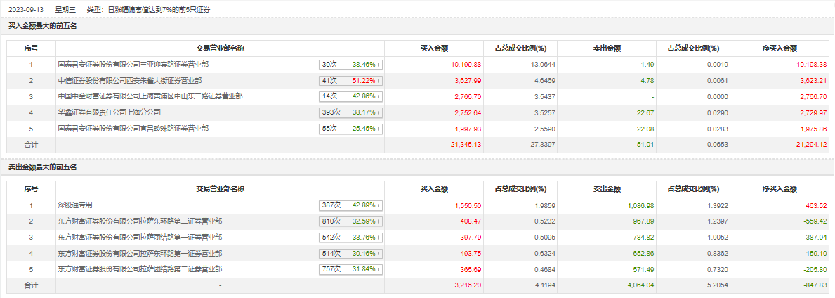 具体来看,知名游资现身龙虎榜,国泰君安证券三亚迎宾路证券营业部、方新侠(中信证券西安朱雀大街证券营业部)分别买入1.02亿元、3627.99万元;深股通专用、东方财富证券拉萨东环路第二证券营业部分别卖出1086.98万元、967.89万元。