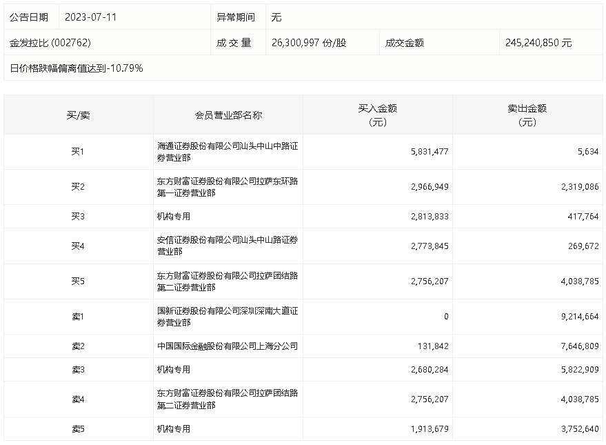 7月11日,金发拉比今日跌停,龙虎榜数据显示,上榜营业部席位全天成交5535.61万元,占当日总成交金额比例为22.57%。其中,买入金额为2186.81万元,卖出金额为3348.8万元,合计净卖出1161.98万元。