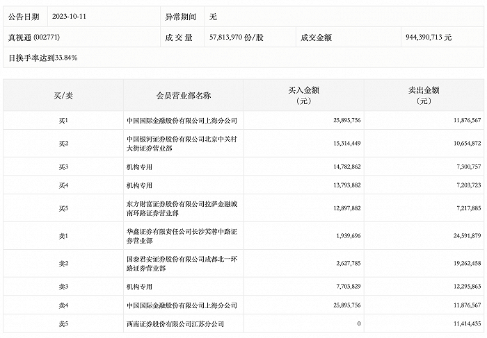 10月11日,真视通今日跌9.76%,全天换手率达33.84%,振幅达13.69%。龙虎榜数据显示,营业部席位合计净卖出1686.23万元。其中,机构买入3628.06万元,卖出2680.03万元,合计净买入948.02万元。此外,华鑫证券长沙芙蓉中路证券营业部、国泰君安证券成都北一环路证券营业部分别卖出2459.19万元、1926.25万元;中国国际金融上海分公司、中国银河证券北京中关村大街证券营业部分别买入2589.58万元、1531.44万元。