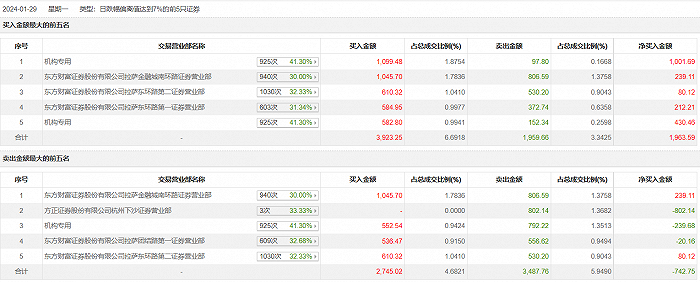 真视通1月29日跌停,全天换手率达16.92%,振幅达10.69%。龙虎榜数据显示,营业部席位合计净买入901.61万元。其中,机构买入2234.82万元,卖出1042.35万元,合计净买入1192.47万元。此外,东方财富证券拉萨金融城南环路证券营业部、方正证券杭州下沙证券营业部分别卖出806.59万元、802.14万元;东方财富证券拉萨金融城南环路证券营业部、东方财富证券拉萨东环路第二证券营业部分别买入1045.70万元、610.32万元。