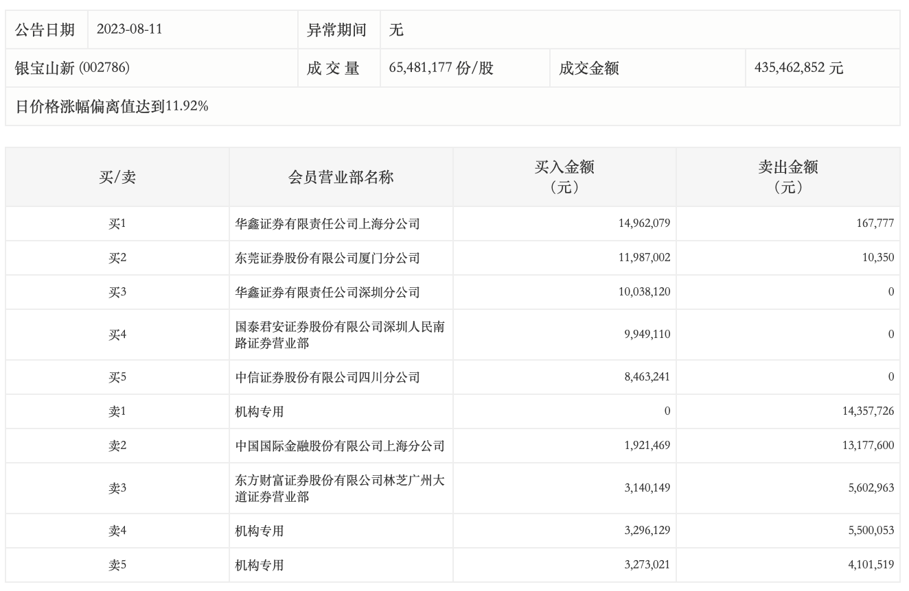 8月11日,银宝山新今日涨停,全天换手率达13.25%,振幅达9.89%。龙虎榜数据显示,营业部席位合计净买入2411.23万元。其中,机构买入656.91万元,卖出2395.93万元,合计净卖出1739.01万元。此外,华鑫证券上海分公司、东莞证券厦门分公司分别买入1496.21万元、1198.70万元;中国国际金融上海分公司、东方财富证券林芝广州大道证券营业部分别卖出1317.76万元、560.30万元。