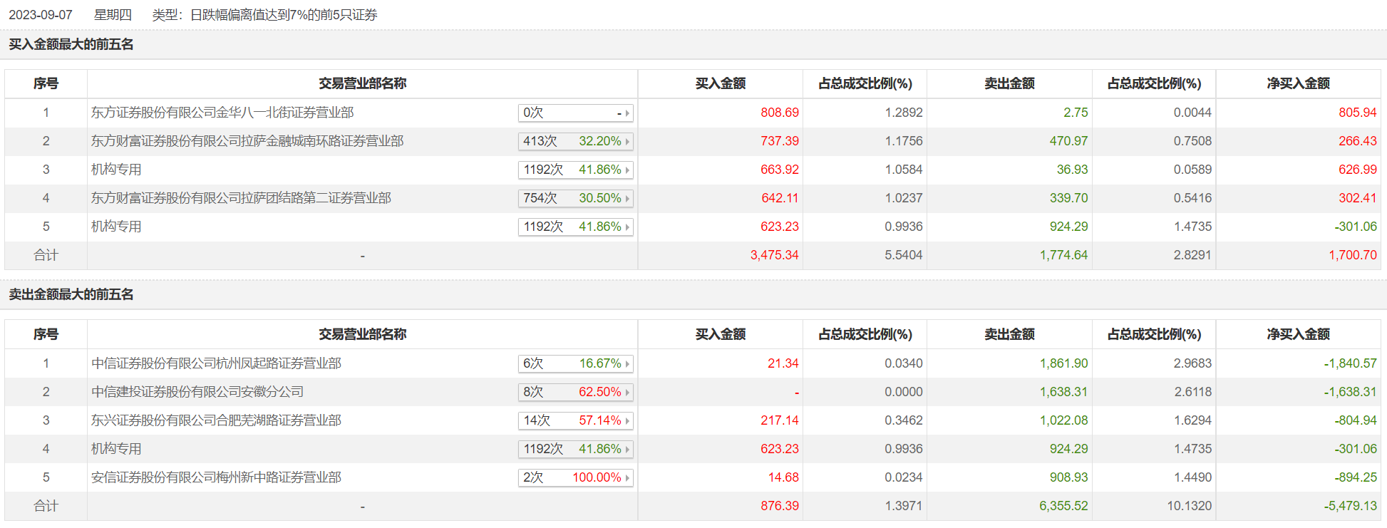 永和智控9月7日跌停,龙虎榜数据显示,上榜营业部席位全天成交1.09亿元,占当日总成交金额比例为17.43%。其中,买入金额为3728.49万元,卖出金额为7205.87万元,合计净卖出3477.37万元。