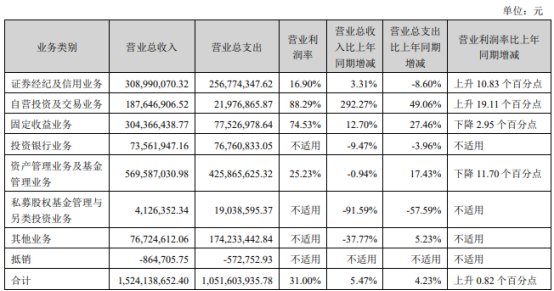 主营业务分业务来看,第一创业证券经纪及信用业务实现营业总收入3.09亿元,同比增长3.31%;自营投资及交易业务实现营业总收入1.88亿元,同比增长292.27%;固定收益业务实现营业总收入3.04亿元,同比增长12.70%;投资银行业务实现营业总收入7356.19万元,同比下降9.47%;资产管理业务及基金管理业务5.70亿元,同比下降0.94%;私募股权基金管理与另类投资业务实现营业总收入412.64万元,同比下降91.59%;其他业务实现营业总收入7672.46万元,同比下降37.77%。