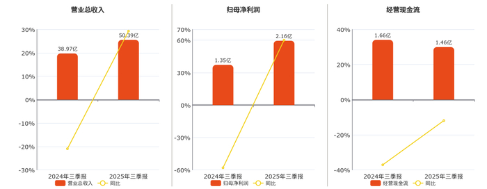 公司营业总收入为50.39亿元。归母净利润为2.16亿元。经营活动现金净流入为1.46亿元,较去年同报告期经营活动现金净流入减少1973.48万元,同比较去年同期下降11.92%。