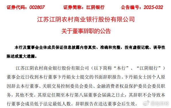 公告显示,江阴银行董事会近日收到本行董事卞丹娟女士提交的书面辞职报告。卞丹娟女士因个人原因辞去本行董事、关联交易控制委员会委员、金融消费者权益保护委员会委员职务,其他不变。