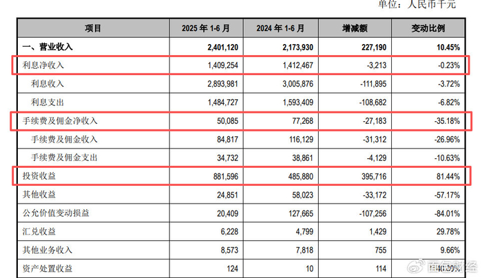 传统业务方面,随着净息差的持续收窄,2025年上半年江阴银行利息净收入为14.09亿元,较2024年同期减少约0.03亿元,微降0.23%。
