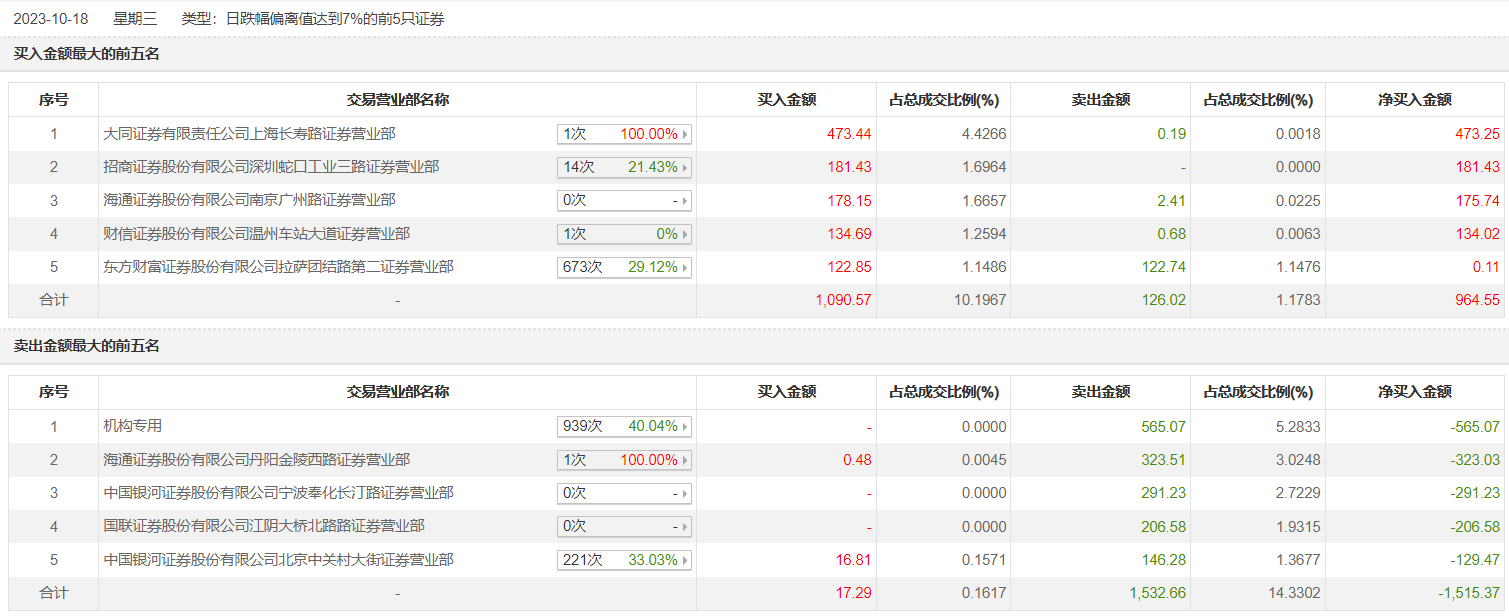 红墙股份10月18日跌停,全天换手率达8.05%,振幅达2.25%。龙虎榜数据显示,营业部席位合计净卖出550.82万元。其中,机构合计净卖出565.07万元。此外,海通证券丹阳金陵西路证券营业部、中国银河证券宁波奉化长汀路证券营业部分别卖出323.51万元、291.23万元;大同证券上海长寿路证券营业部、招商证券深圳蛇口工业三路证券营业部分别买入473.44万元、181.43万元。