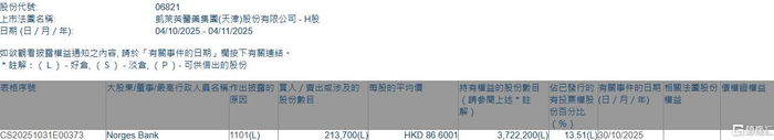 格隆汇11月4日丨根据联交所最新权益披露资料显示,2025年10月30日,凯莱英(06821.HK)获Norges Bank在场内以每股均价86.6001港元增持21.37万股,涉资约1850.64万港元。