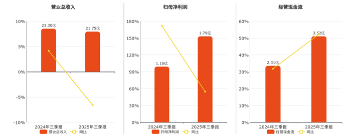 公司营业总收入为21.75亿元,较去年同报告期营业总收入减少1.54亿元,同比较去年同期下降6.62%。归母净利润为1.79亿元。经营活动现金净流入为3.52亿元。