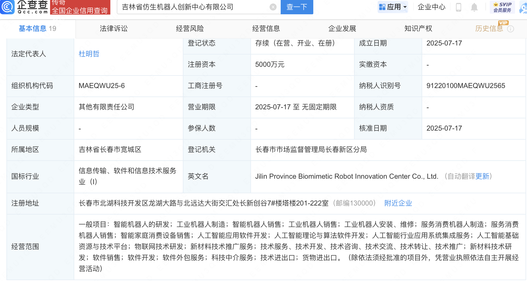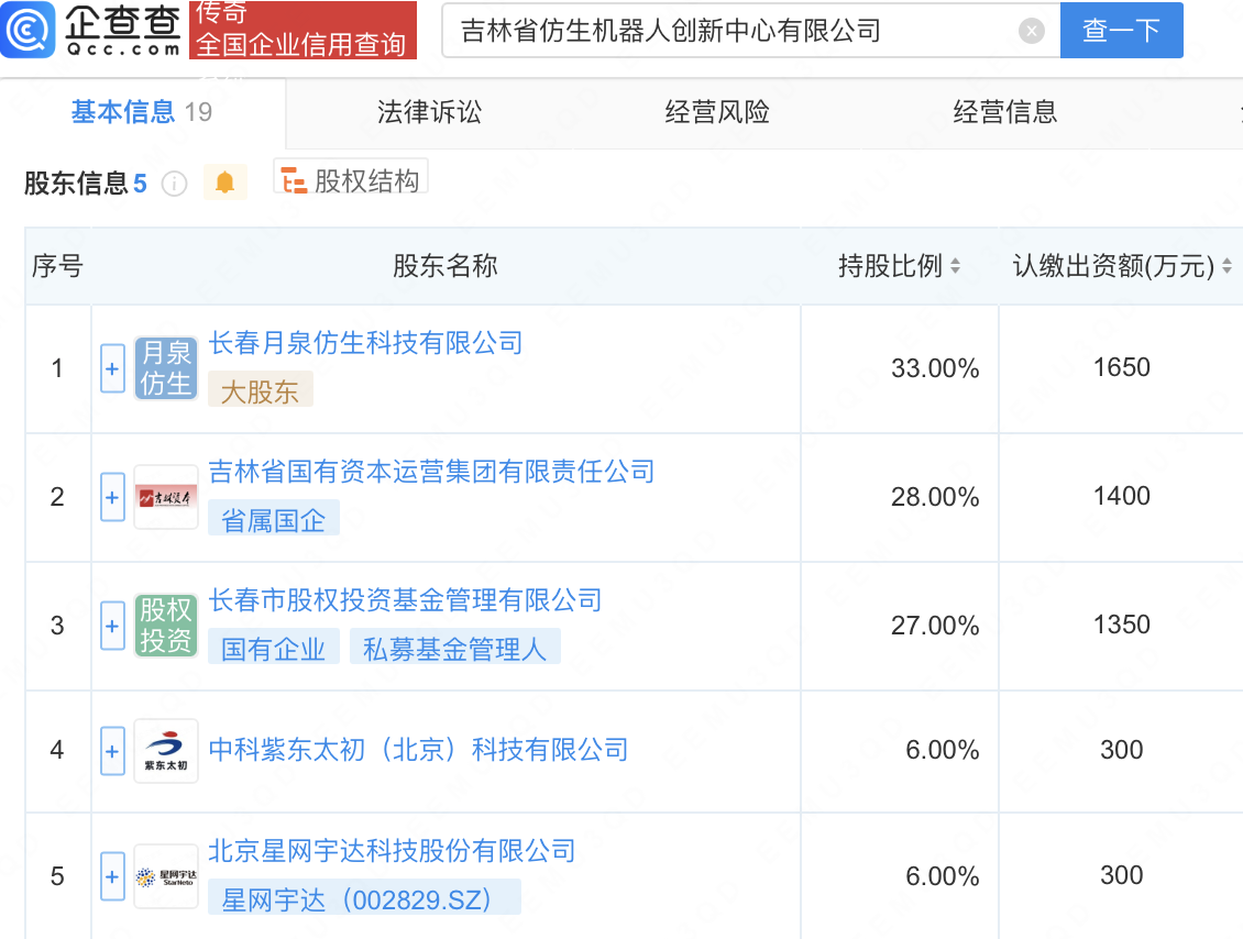 企查查APP显示,近日,吉林省仿生机器人创新中心有限公司成立,注册资本5000万元,经营范围包含:智能机器人的研发;工业机器人制造;智能机器人销售;人工智能行业应用系统集成服务;人工智能基础资源与技术平台等。企查查股权穿透显示,该公司由星网宇达(002829)等共同持股。