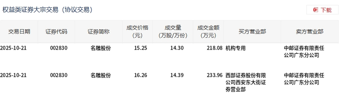 10月21日,名雕股份大宗交易成交28.69万股,成交额452.04万元,占当日总成交额的9.4%,成交均价15.76元,较市场收盘价17.31元折价8.98%,其中最高成交价16.26元,最低成交价15.25元。