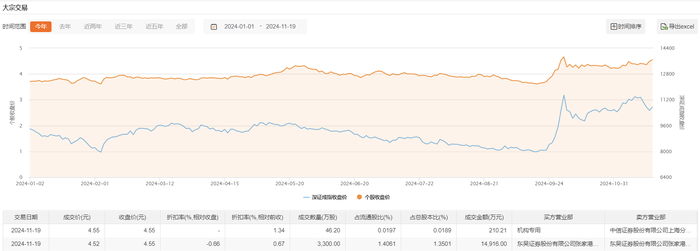 11月19日,张家港行今日大宗交易成交3346.2万股,成交额1.51亿元,占当日总成交额的28.67%,成交均价4.52元,较市场收盘价折价0.66%,其中最高成交价4.55元,最低成交价4.52元。
