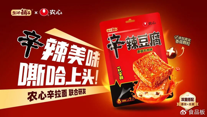 在食品板看来,无论是大魔王和六必居携手推出大魔王麻酱素毛肚,还是此次盐津铺子联名农心发布辛辣豆腐,都为品牌跨界联名重构了新的范式。这并非是简单的品牌叠加,而是品牌内核的深度契合和品牌调性的协同共振,让联名产品跳出了“短期流量噱头” 的局限,为产品注入了长远发展的生命力。尤其是在零食行业创新逐渐从“单一口味迭代” 转向 “跨品类、跨文化融合” 的当下,这种将不同饮食文化中的核心元素拆解、重组的创新方式,通过食材与风味的互补,为产品形成了独树一帜的记忆点,恰是对当前消费市场“既要新鲜感,又要高品质” 需求的精准呼应。