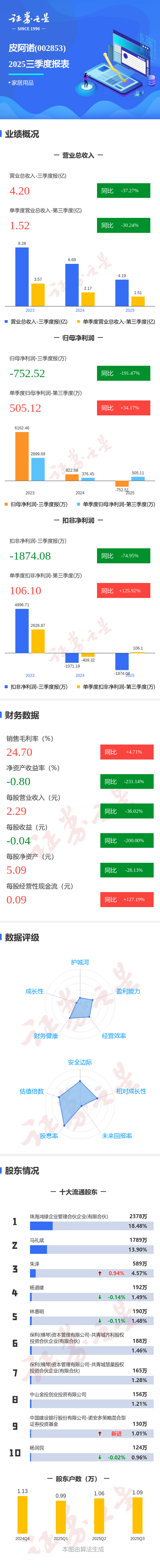 证券之星消息,皮阿诺2025年三季报显示,前三季度公司主营收入4.2亿元,同比下降37.27%;归母净利润-752.52万元,同比下降191.47%;扣非净利润-1874.08万元,同比下降74.95%;其中2025年第三季度,公司单季度主营收入1.52亿元,同比下降30.24%;单季度归母净利润505.12万元,同比上升34.18%;单季度扣非净利润106.1万元,同比上升125.92%;负债率37.31%,投资收益223.15万元,财务费用-34.04万元,毛利率24.7%。