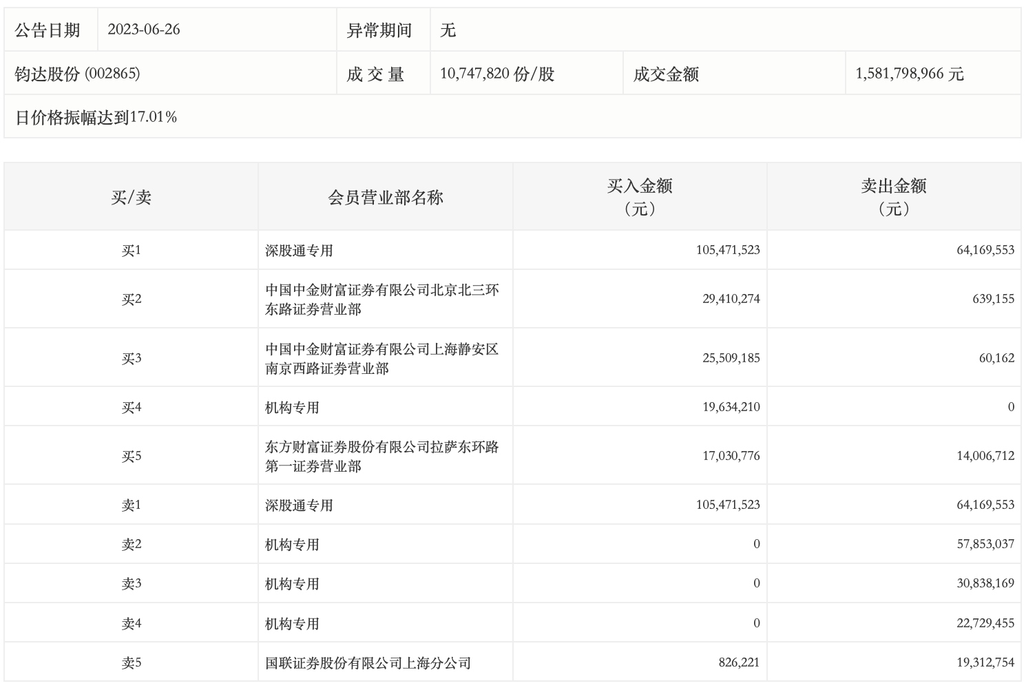 6月26日,钧达股份今日涨4.24%,成交额15.82亿元,换手率5.54%,盘后龙虎榜数据显示,深股通专用席位买入1.05亿元并卖出6416.96万元,一机构净买入1963.42万元,三机构净卖出1.11亿元。