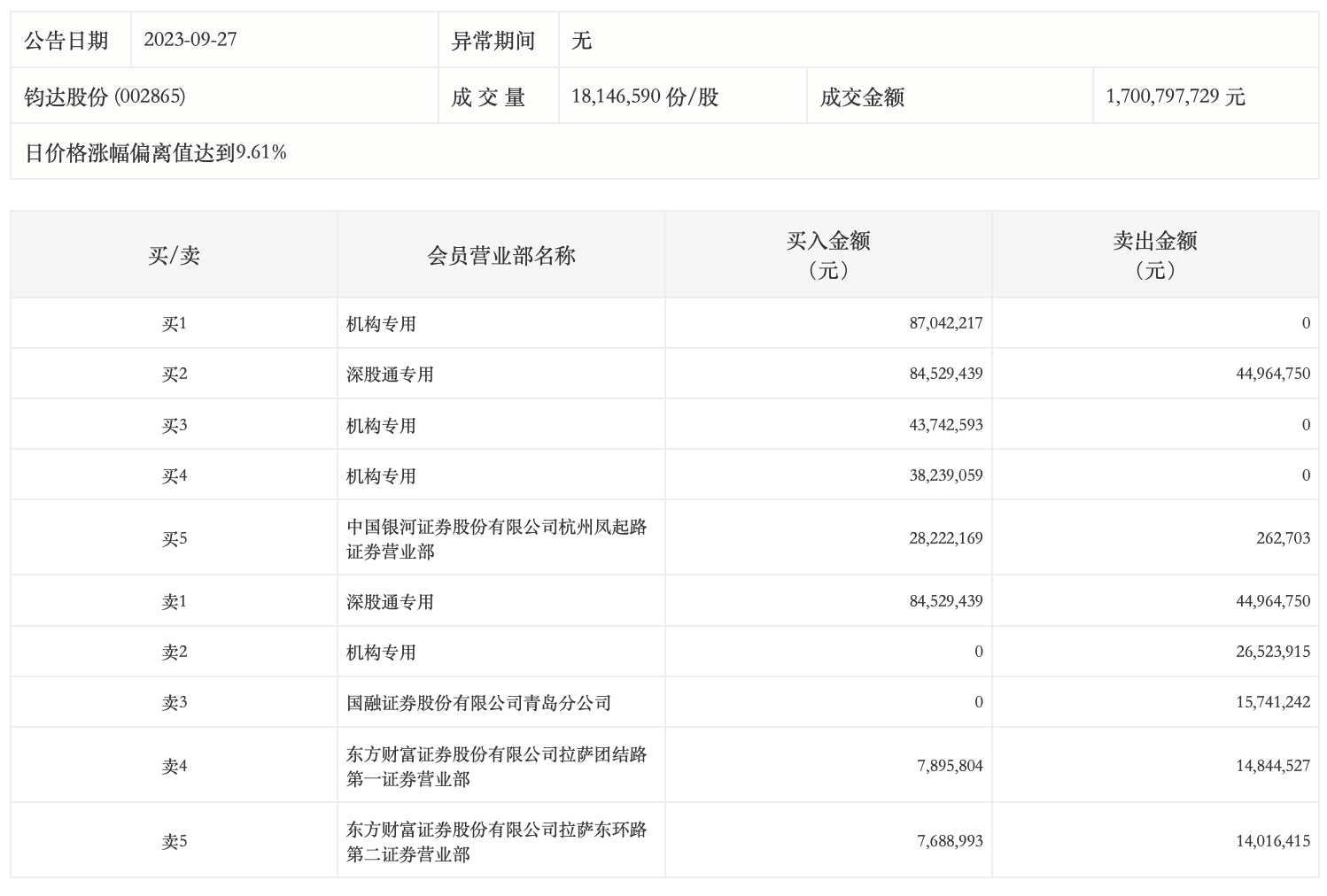 9月27日,钧达股份今日涨停,全天换手率达9.32%,振幅达10.04%。龙虎榜数据显示,营业部席位合计净买入1.81亿元。其中,机构买入1.69亿元,卖出2652.39万元,合计净买入1.42亿元。此外,深股通专用、中国银河证券杭州凤起路证券营业部分别买入8452.94万元、2822.22万元;深股通专用、国融证券青岛分公司分别卖出4496.48万元、1574.12万元。