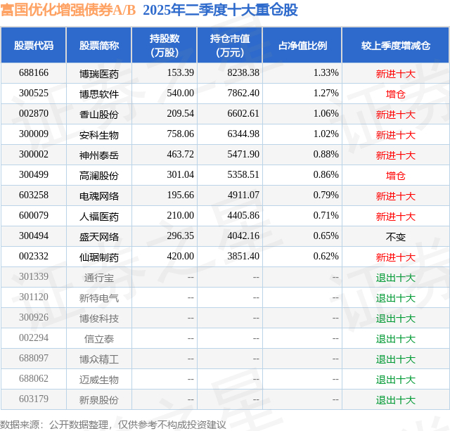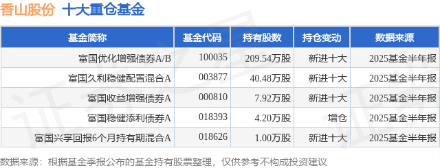根据2025基金半年报公募基金重仓股数据,重仓该股的公募基金共5家,其中持有数量最多的公募基金为富国基金的富国优化增强债券A/B。富国优化增强债券A/B目前规模为19.99亿元,最新净值2.074(10月14日),较上一交易日下跌0.38%,近一年上涨28.98%。该公募基金现任基金经理为刘兴旺。刘兴旺在任的基金产品包括:富国裕利债券A,管理时间为2022年7月28日至今,期间收益率为13.81%;富国久利稳健配置混合A,管理时间为2022年12月8日至今,期间收益率为56.25%;富国稳健添利债券A,管理时间为2023年5月30日至今,期间收益率为15.26%。