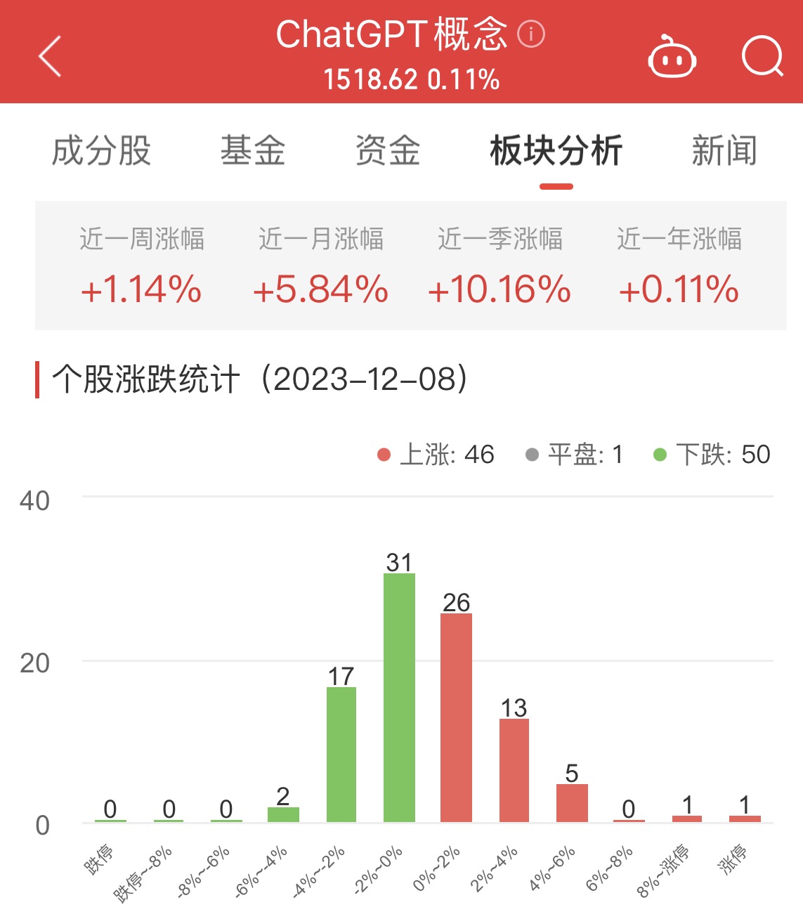 中国经济网北京12月8日讯今日,ChatGPT概念板块整体涨幅0.11%,其中46只股票上涨,1只股票平盘,50只股票下跌。