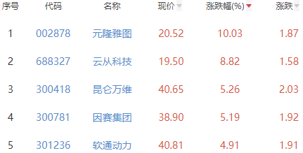 其中,元隆雅图、云从科技、昆仑万维、因赛集团和软通动力位列板块涨幅前五位,涨幅分别为10.03%、8.82%、5.26%、5.19%和4.91%。
