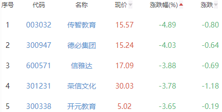 传智教育、德必集团、信雅达、荣信文化和开元教育位列涨幅榜后五位,涨幅分别为-4.89%、-4.03%、-3.88%、-3.78%和-3.65%。