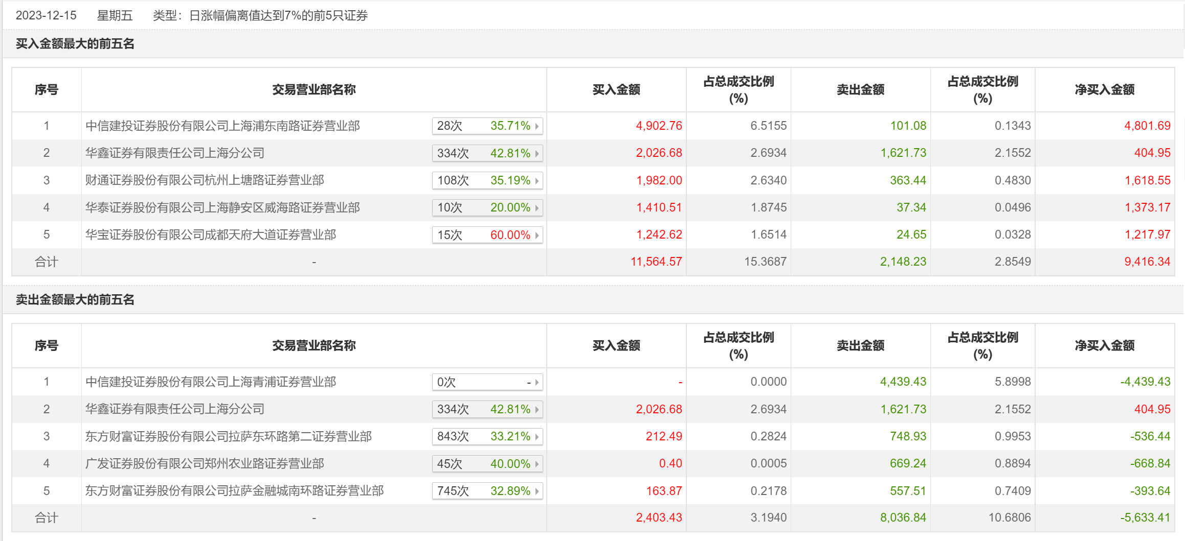 12月15日,元隆雅图今日涨停,全天换手率达19.77%,振幅达11.57%。龙虎榜数据显示,营业部席位合计净买入3377.98万元。其中,中信建投证券上海浦东南路证券营业部、华鑫证券上海分公司分别买入4902.76万元、2026.68万元;中信建投证券上海青浦证券营业部、华鑫证券上海分公司分别卖出4439.43万元、1621.73万元。