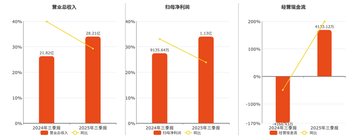公司营业总收入为28.21亿元。归母净利润为1.13亿元。经营活动现金净流入为4133.12万元。