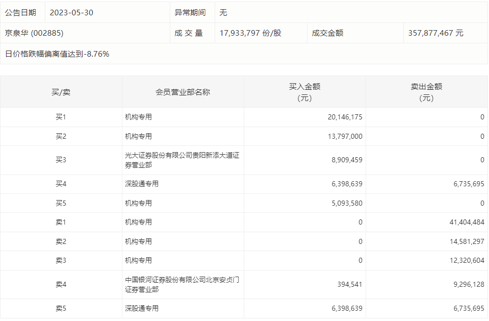 5月30日,京泉华今日跌8.26%,龙虎榜数据显示,上榜营业部席位全天成交1.39亿元,占当日总成交金额比例为38.86%。其中,买入金额为5473.94万元,卖出金额为8433.82万元,合计净卖出2959.88万元。