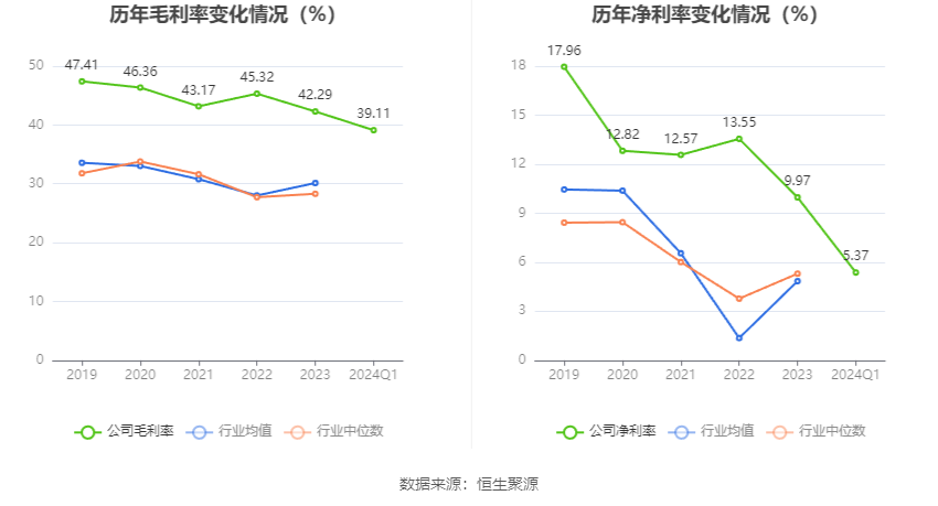 2024年第一季度,公司毛利率为39.11%,同比下降9.86个百分点;净利率为5.37%,较上年同期下降4.58个百分点。