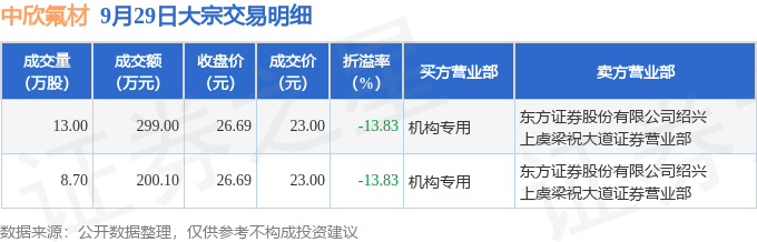 9月29日中欣氟材现2笔折价13.83%的大宗交易 合计成交499.1万元