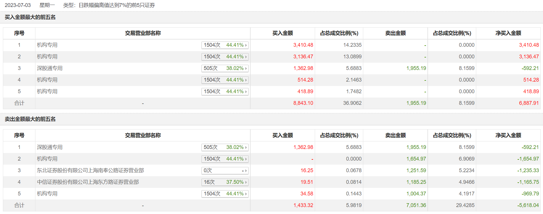 名臣健康7月3日跌停,龙虎榜数据显示,上榜营业部席位全天成交1.6亿元,占当日总成交金额比例为66.63%。其中,买入金额为8913.43万元,卖出金额为7051.36万元,合计净买入1862.07万元。