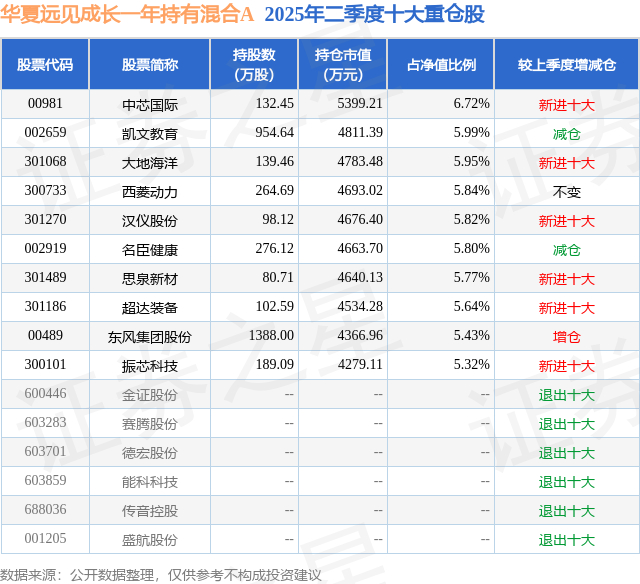 华夏远见成长一年持有混合A的前十大重仓股如下: