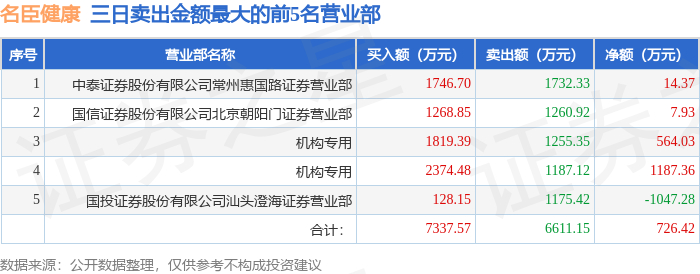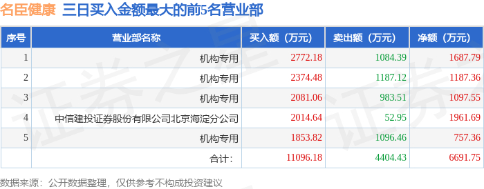 10月14日名臣健康(002919)龙虎榜数据:机构净买入5294.1万元(3日)