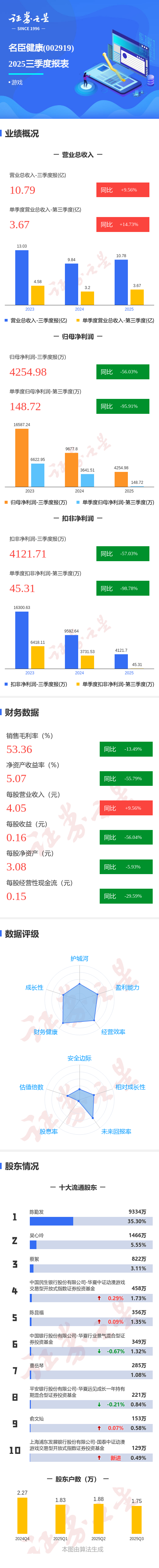 图解名臣健康三季报:第三季度单季净利润同比下降95.92%