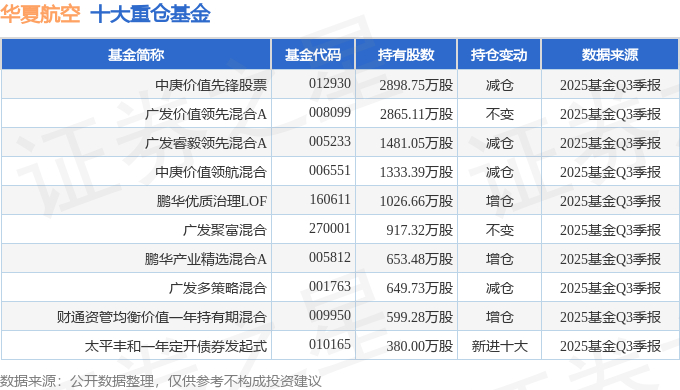 持有华夏航空最多的基金为中庚价值先锋股票,目前规模为32.36亿元,最新净值1.059(10月31日),较上一交易日上涨1.06%,近一年上涨9.1%。该基金现任基金经理为陈涛。
