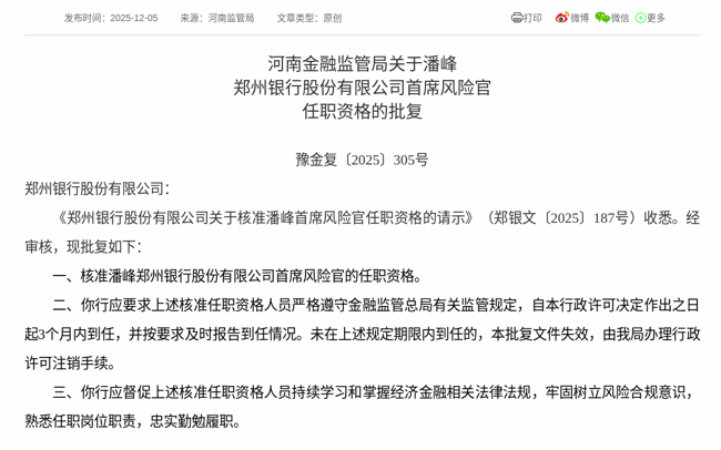2025年12月5日,根据国家金融监督管理总局消息,《郑州银行股份有限公司关于核准潘峰首席风险官任职资格的请示》获得通过,批复潘峰郑州银行股份有限公司首席风险官的任职资格。