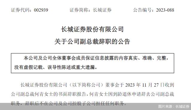 北京商报讯(记者 刘宇阳 郝彦)11月27日,长城证券发布公告表示,董事会于11月27日收到公司副总裁何青的书面辞职报告,何青因到龄退休申请辞去公司副总裁职务,辞职后不在公司及公司控股子公司担任任何职务。