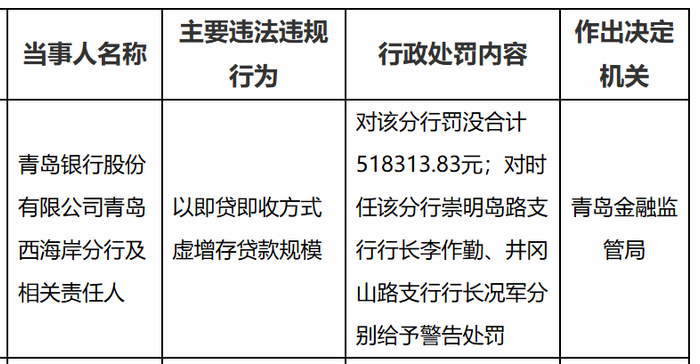 针对上述违法违规行为,国家金融监督管理总局青岛监管分局对其罚没合计518313.83元;对时任该分行崇明岛路支行行长李作勤、井冈山路支行行长况军分别给予警告处罚。