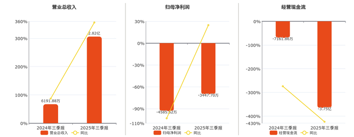公司营业总收入为2.82亿元。归母净利润为-3447.70万元。经营活动现金净流入为-3.75亿元,较去年同报告期经营活动现金净流入减少3.04亿元。