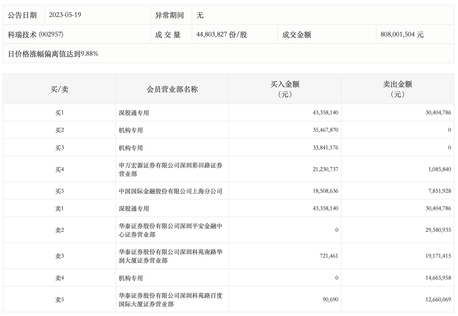 5月19日,科瑞技术今日涨停,龙虎榜数据显示,上榜营业部席位全天成交2.69亿元,占当日总成交金额比例为33.25%。其中,买入金额为1.53亿元,卖出金额为1.15亿元,合计净买入3779.78万元。