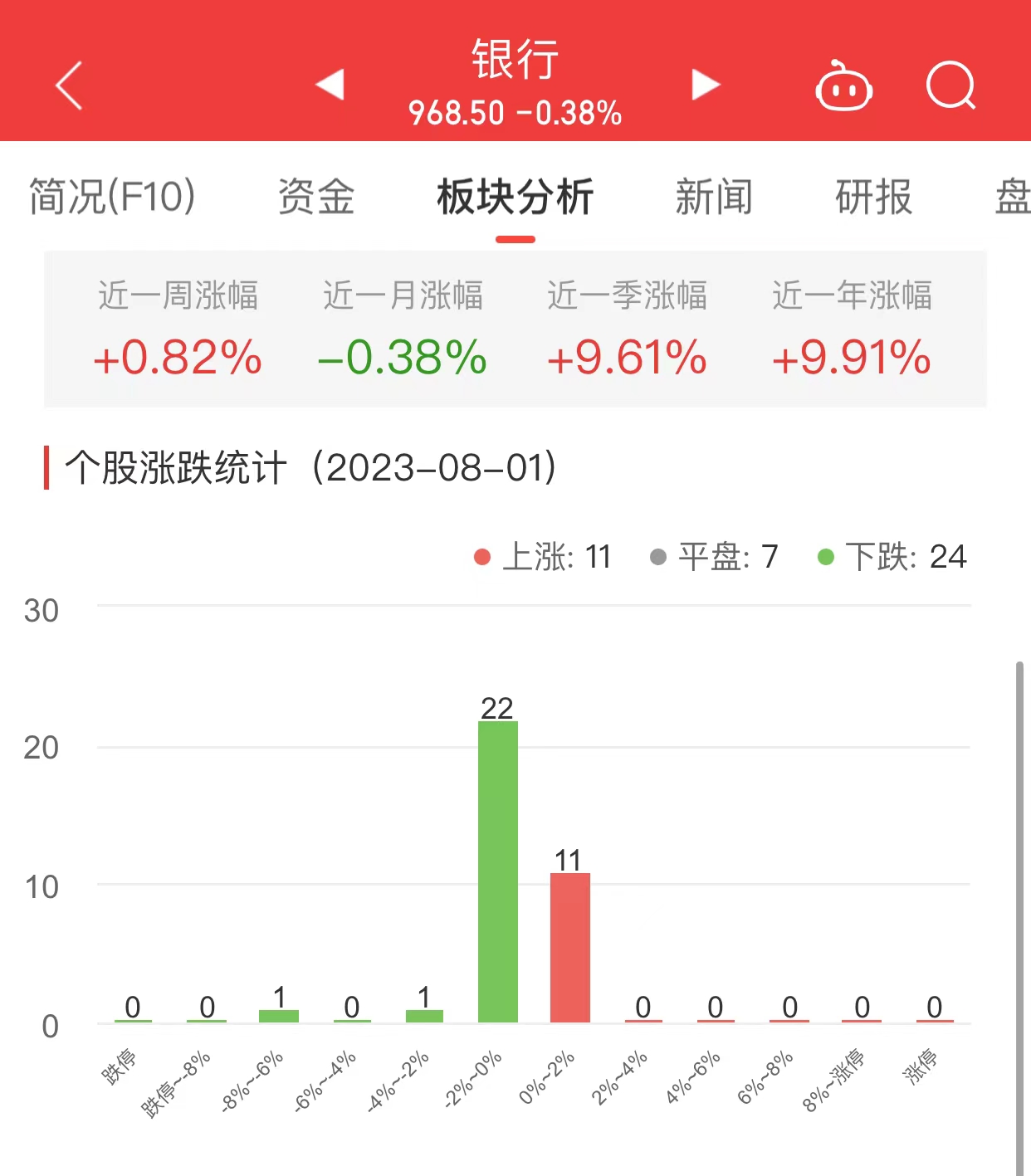 中国经济网北京8月1日讯今日,银行板块整体跌幅0.38%,其中11只股票上涨,7只股票平盘,24只股票下跌。