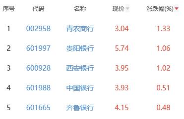 其中,青农商行、贵阳银行、西安银行、中国银行、齐鲁银行位列板块涨幅前五位,涨幅分别为1.33%、1.06%、1.02%、0.51%、0.48%。